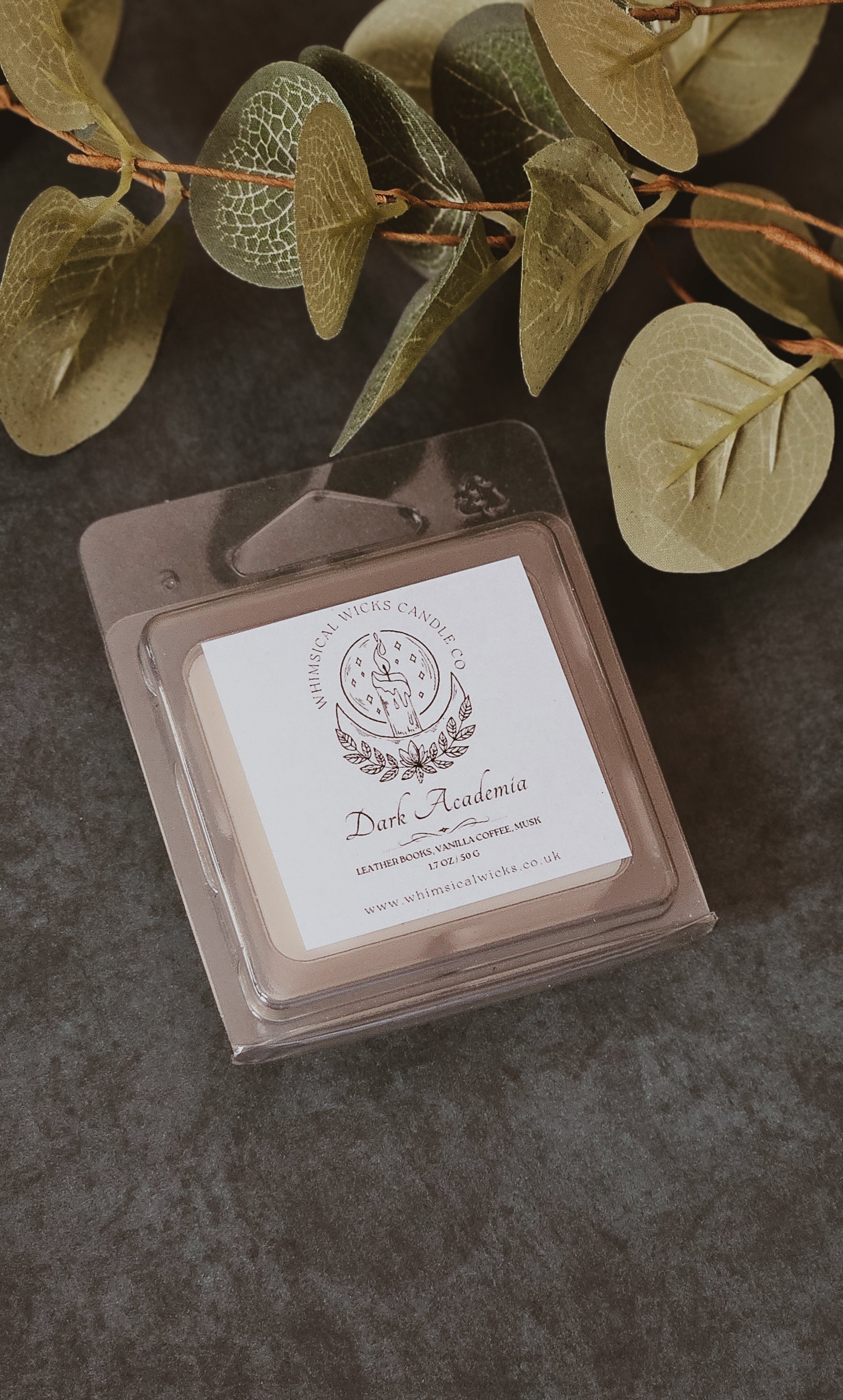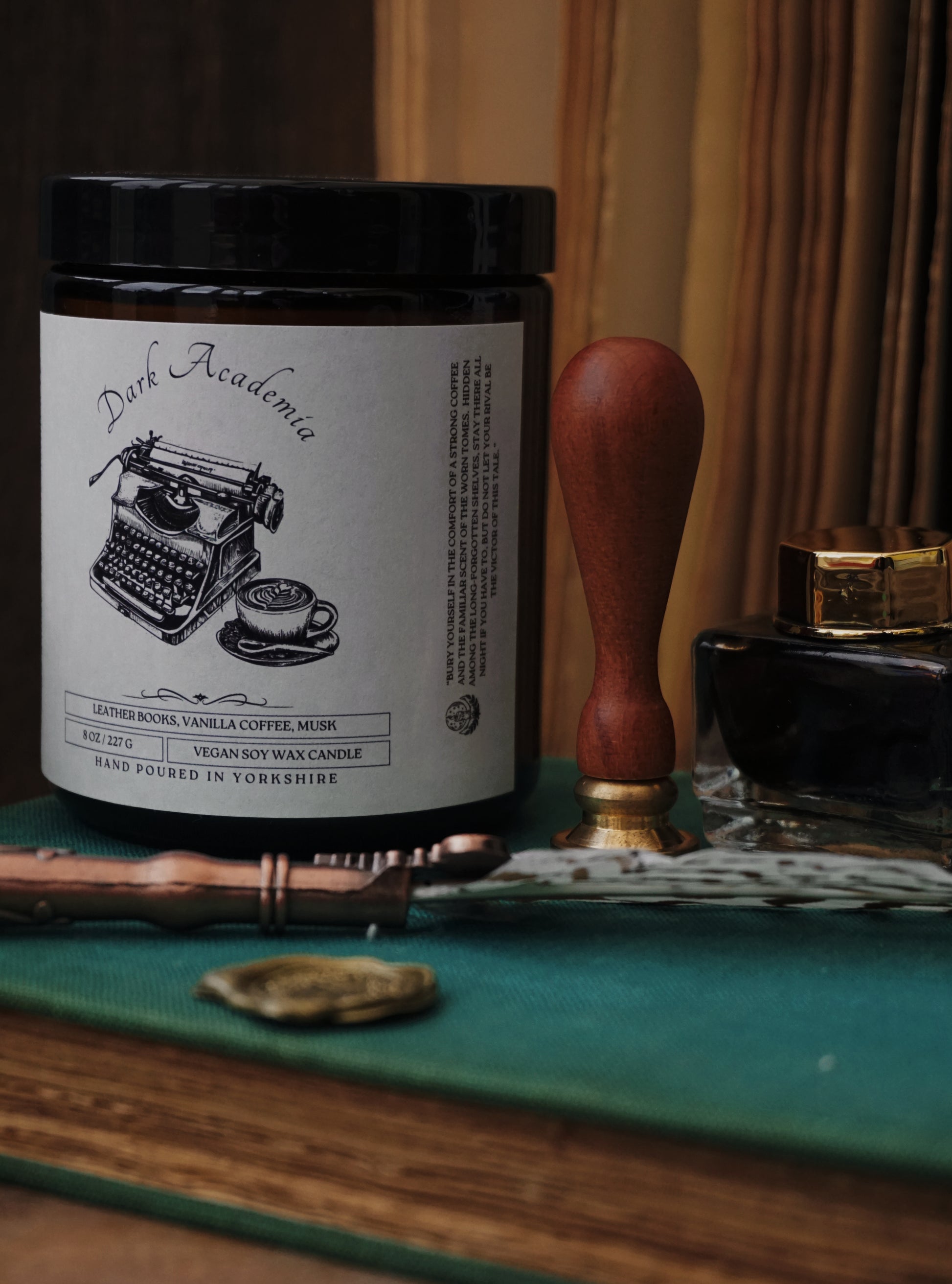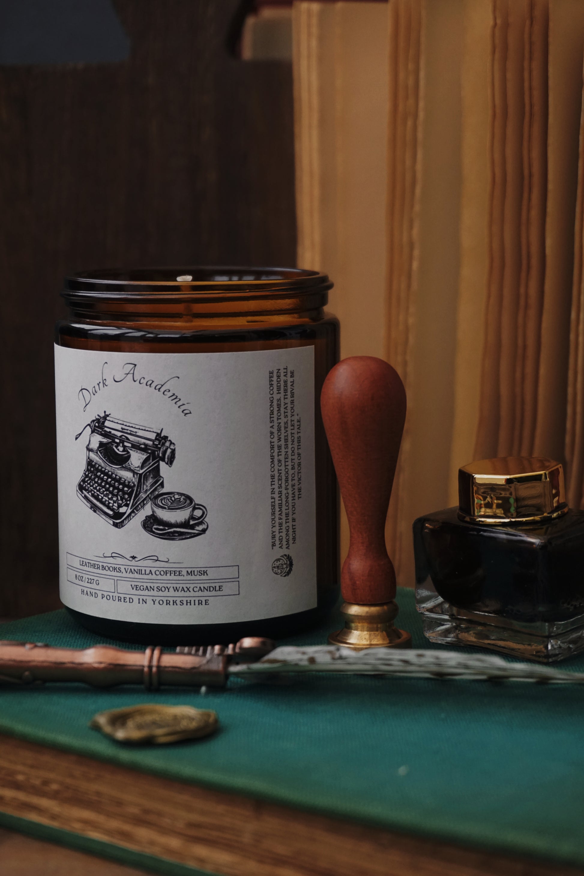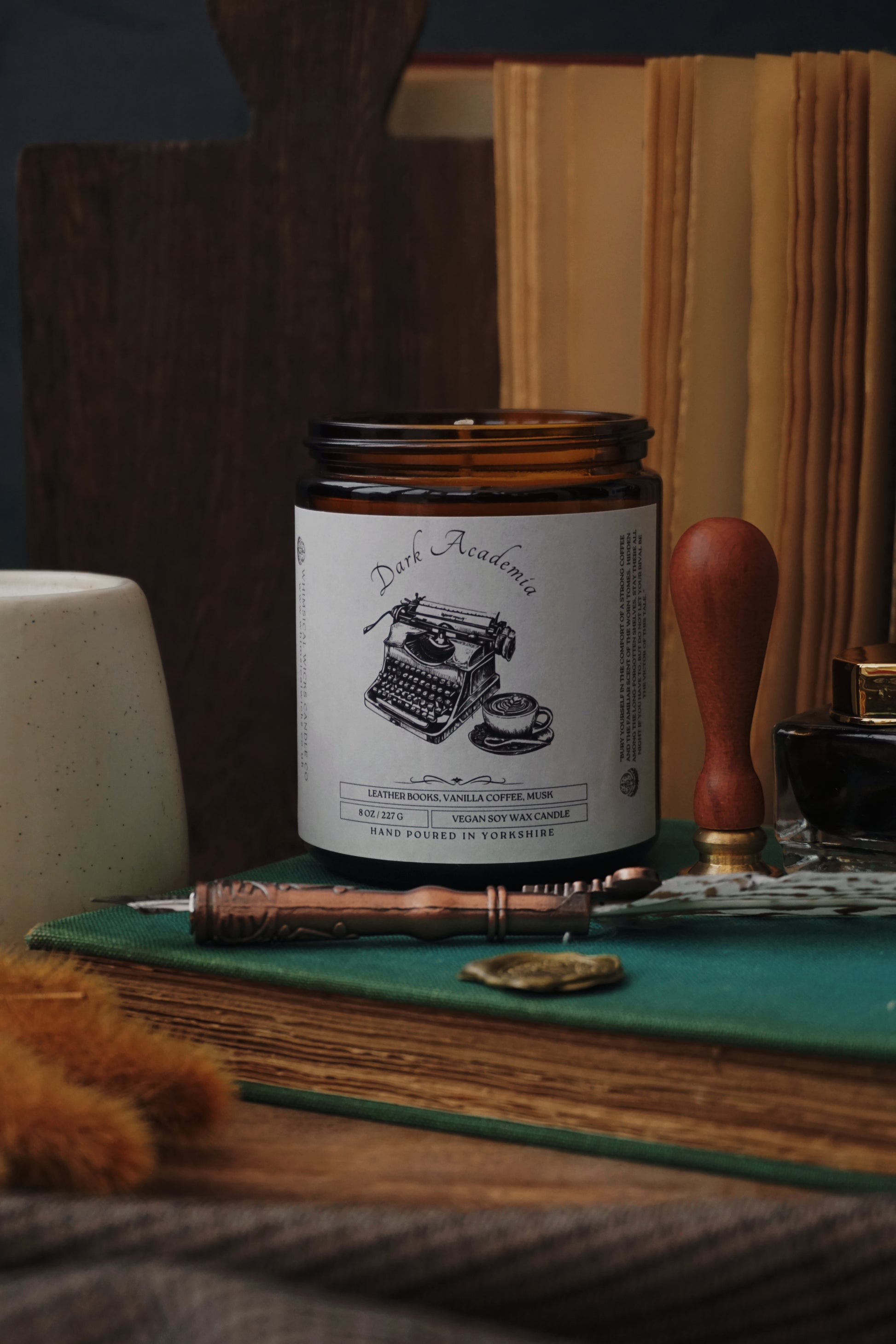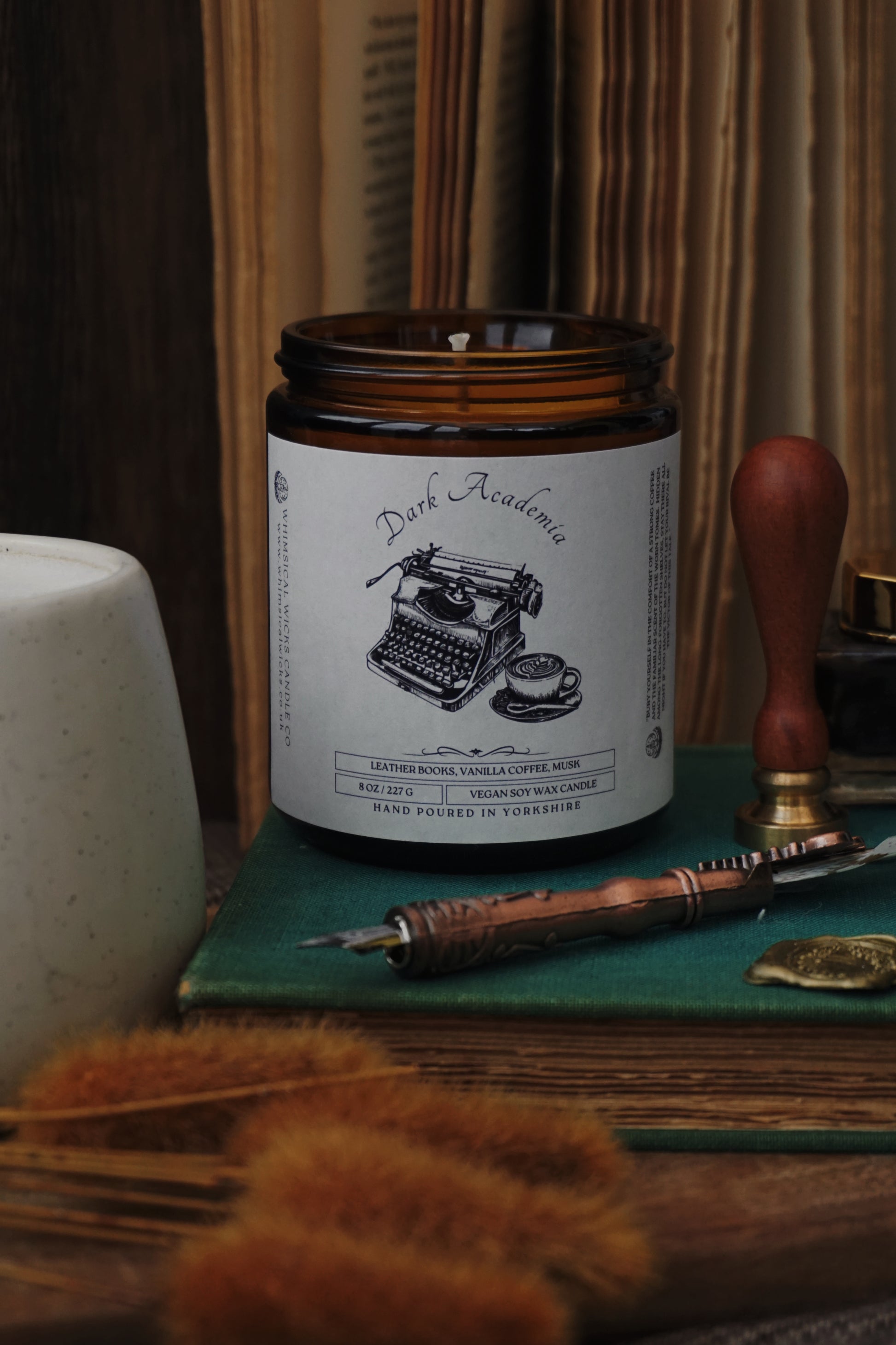 An 8 ounce vegan soy wax candle featuring a comforting blend of leather books, sweet vanilla coffee, and musk.