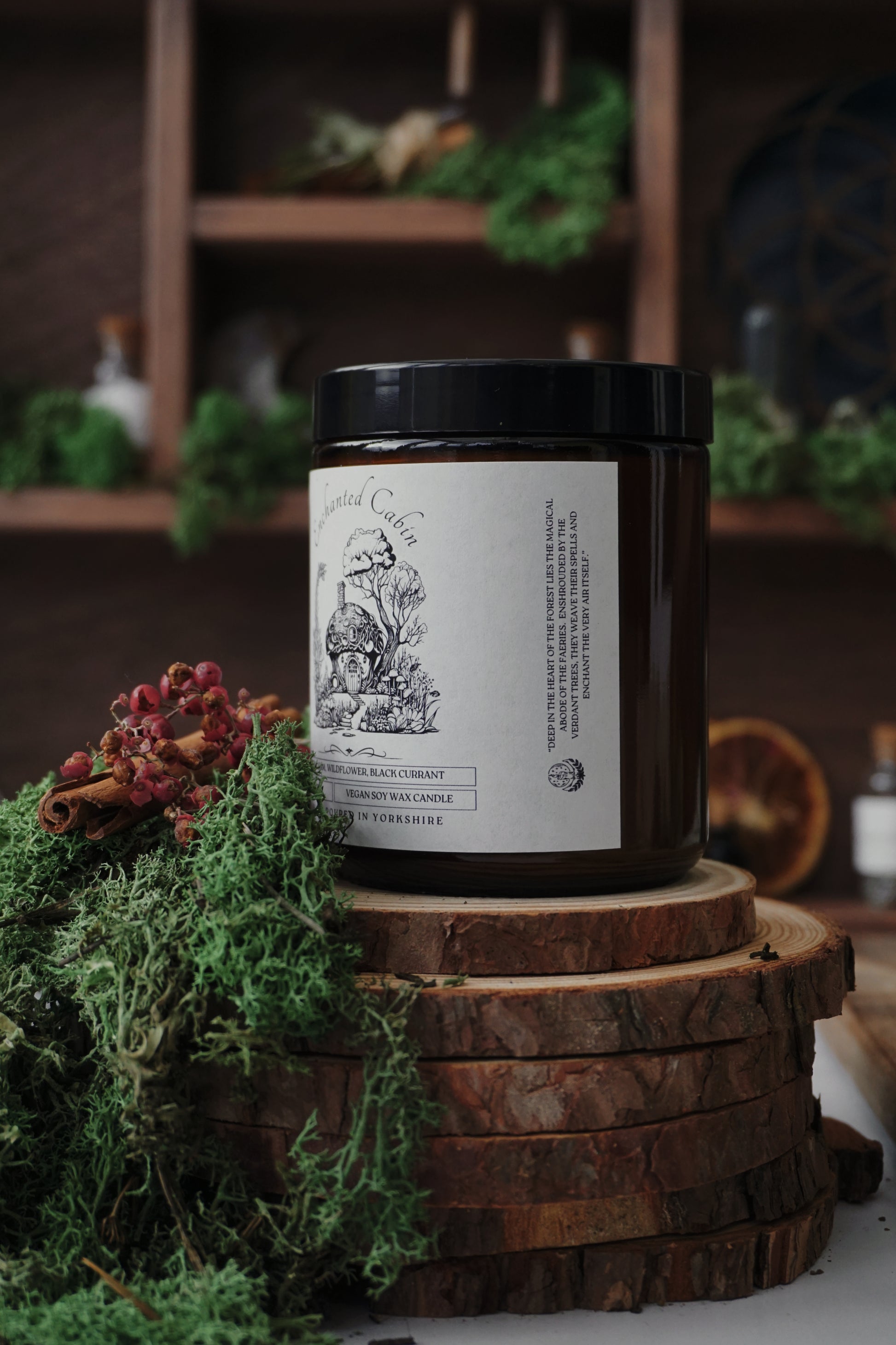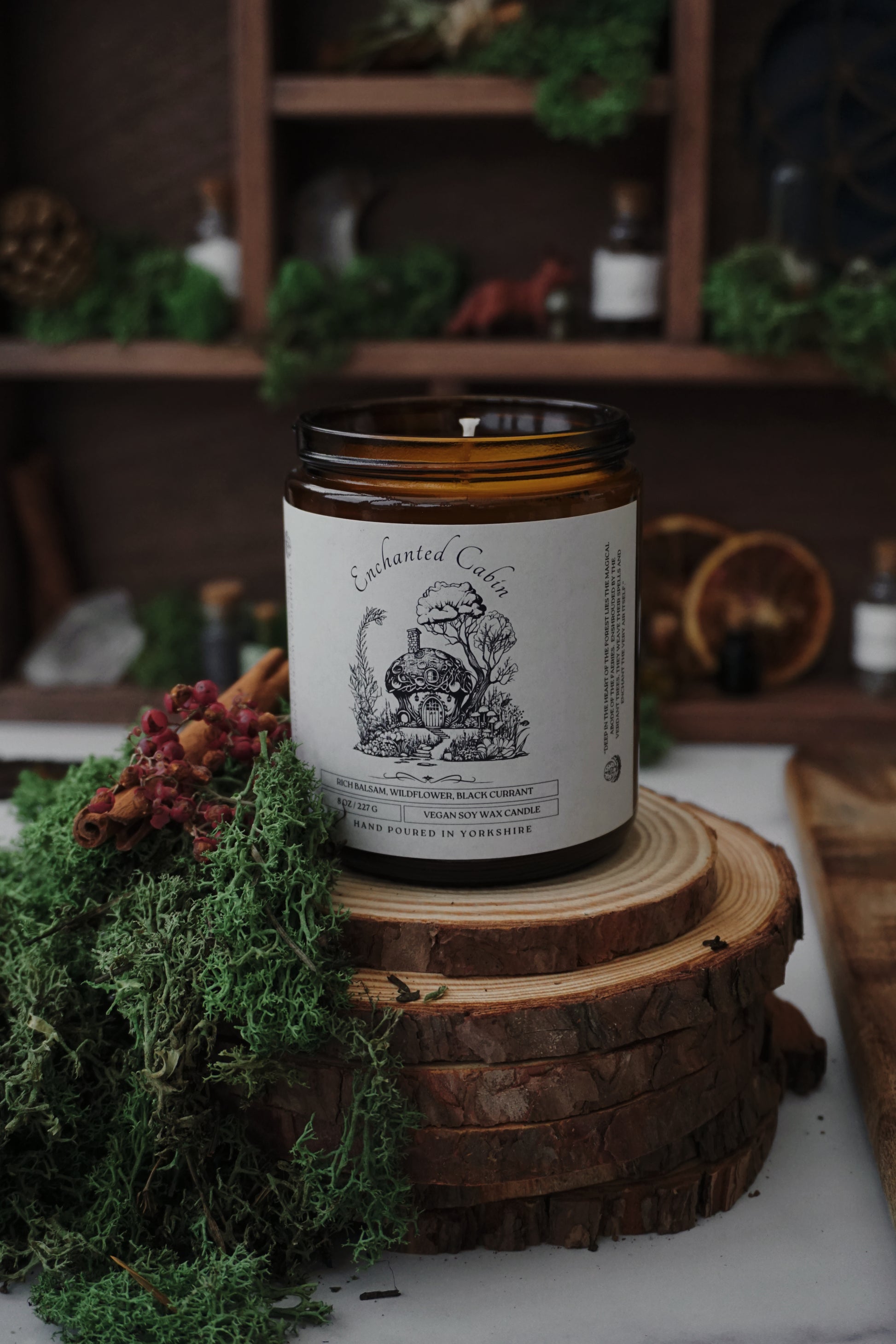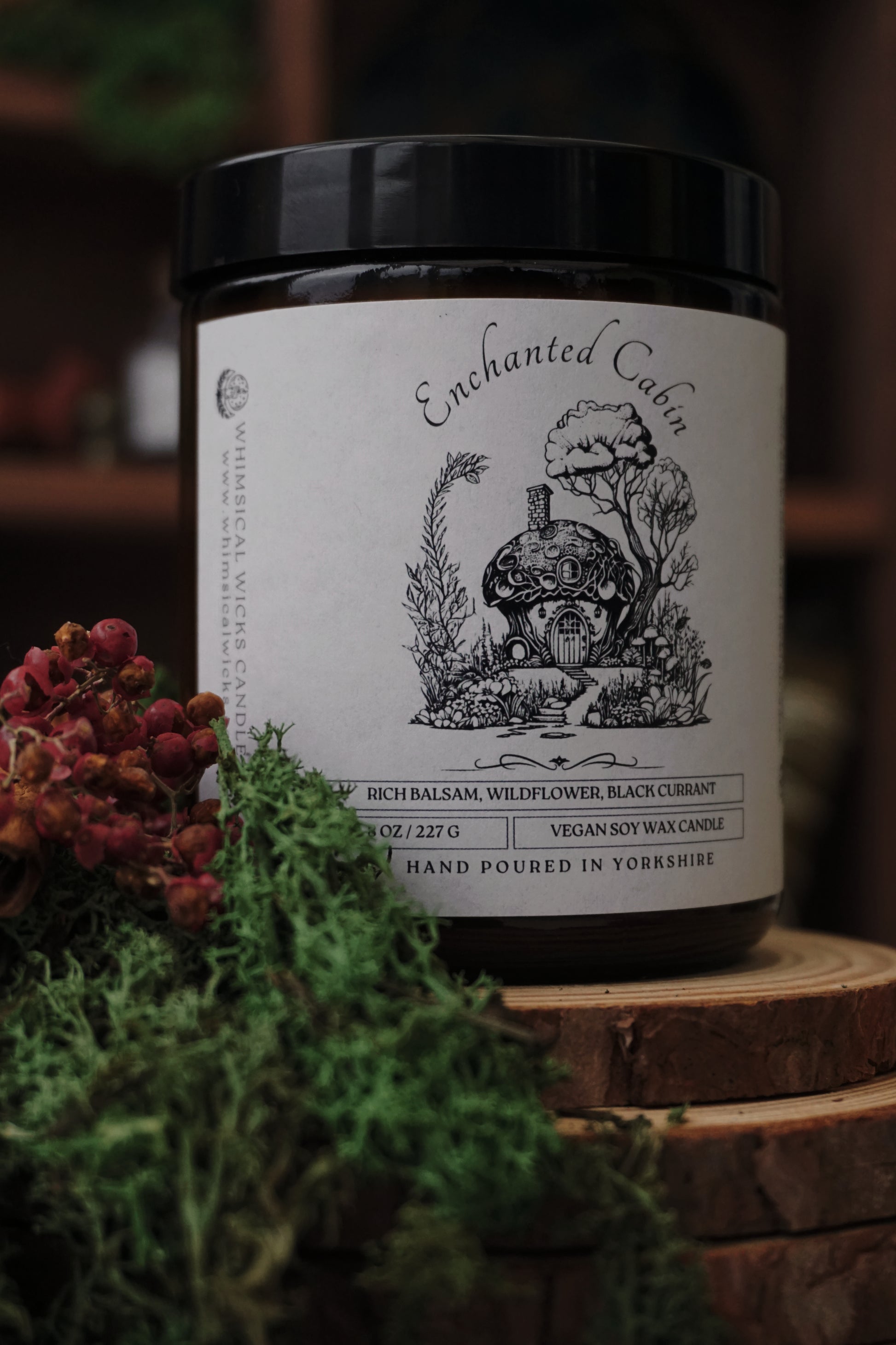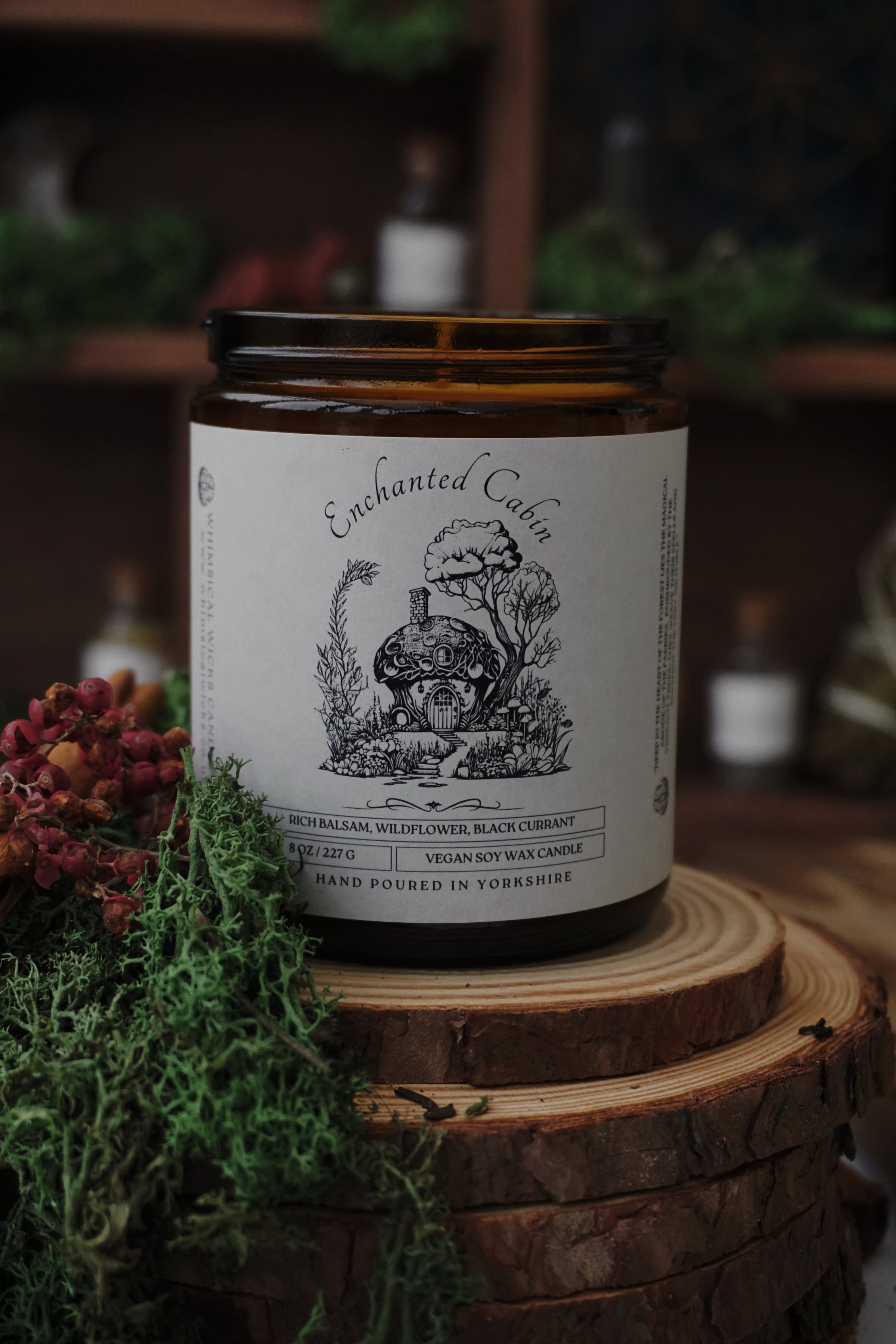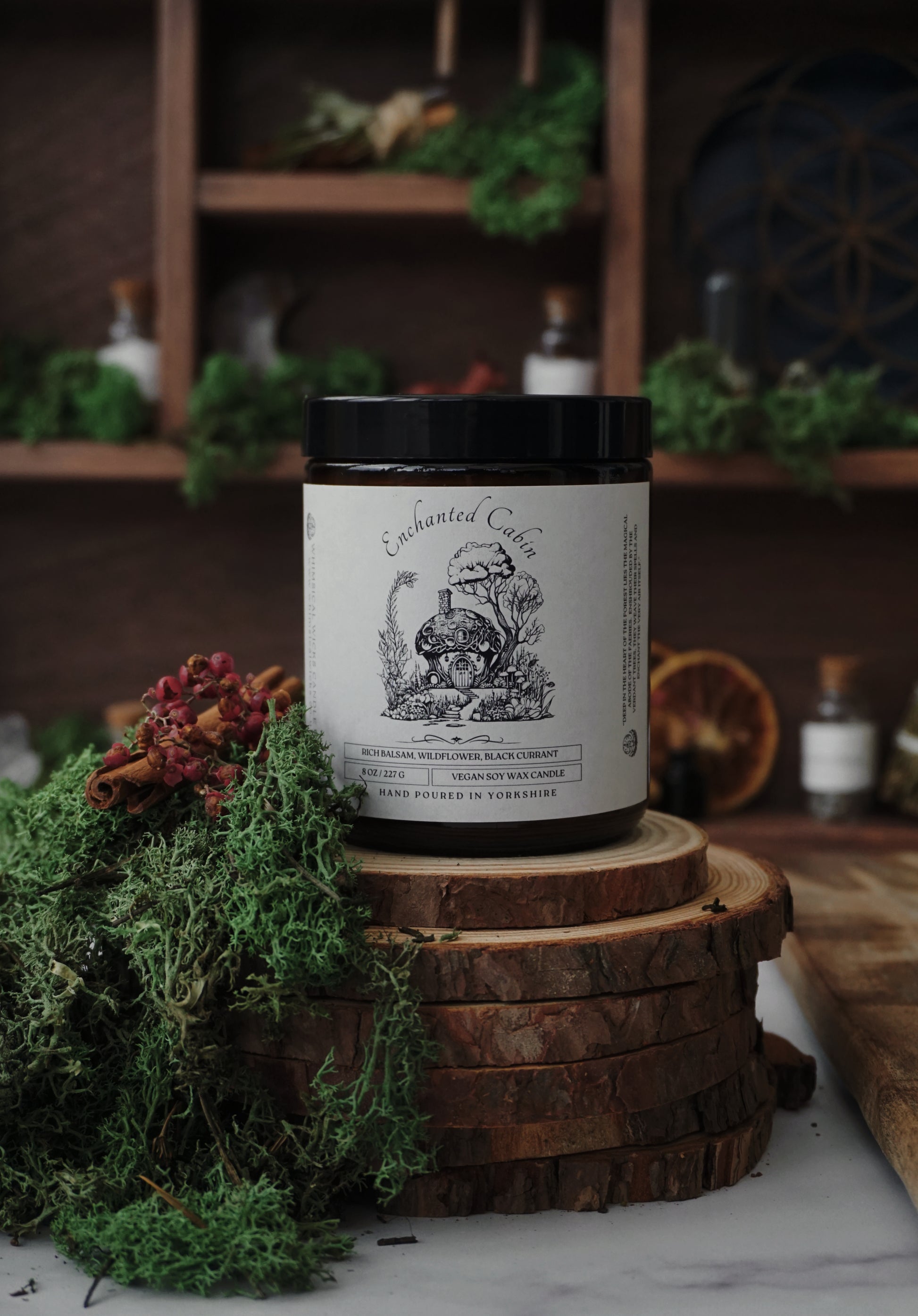 An 8 ounce vegan soy wax candle featuring a robust blend of rich balsam, wildflower, and blackcurrant