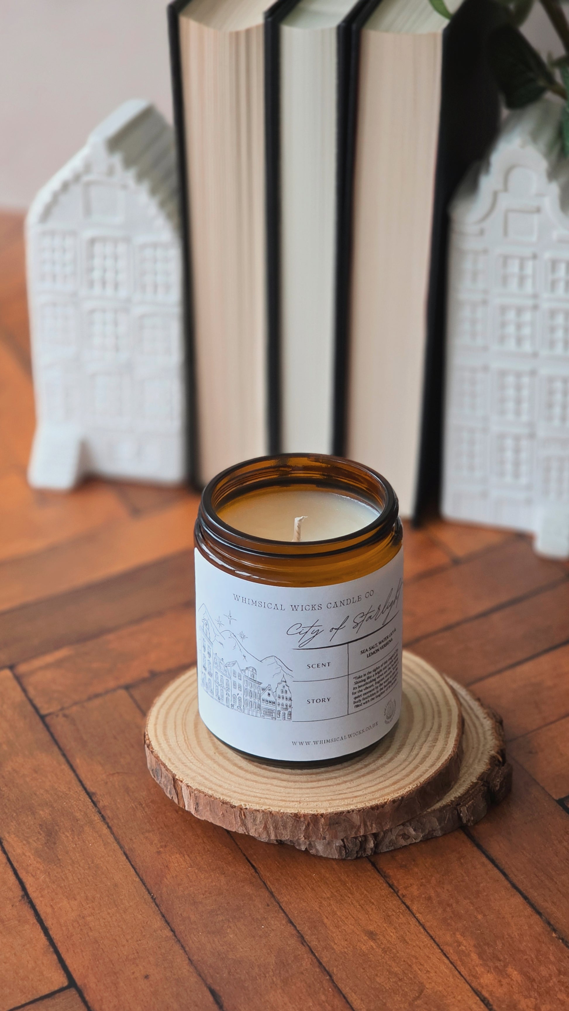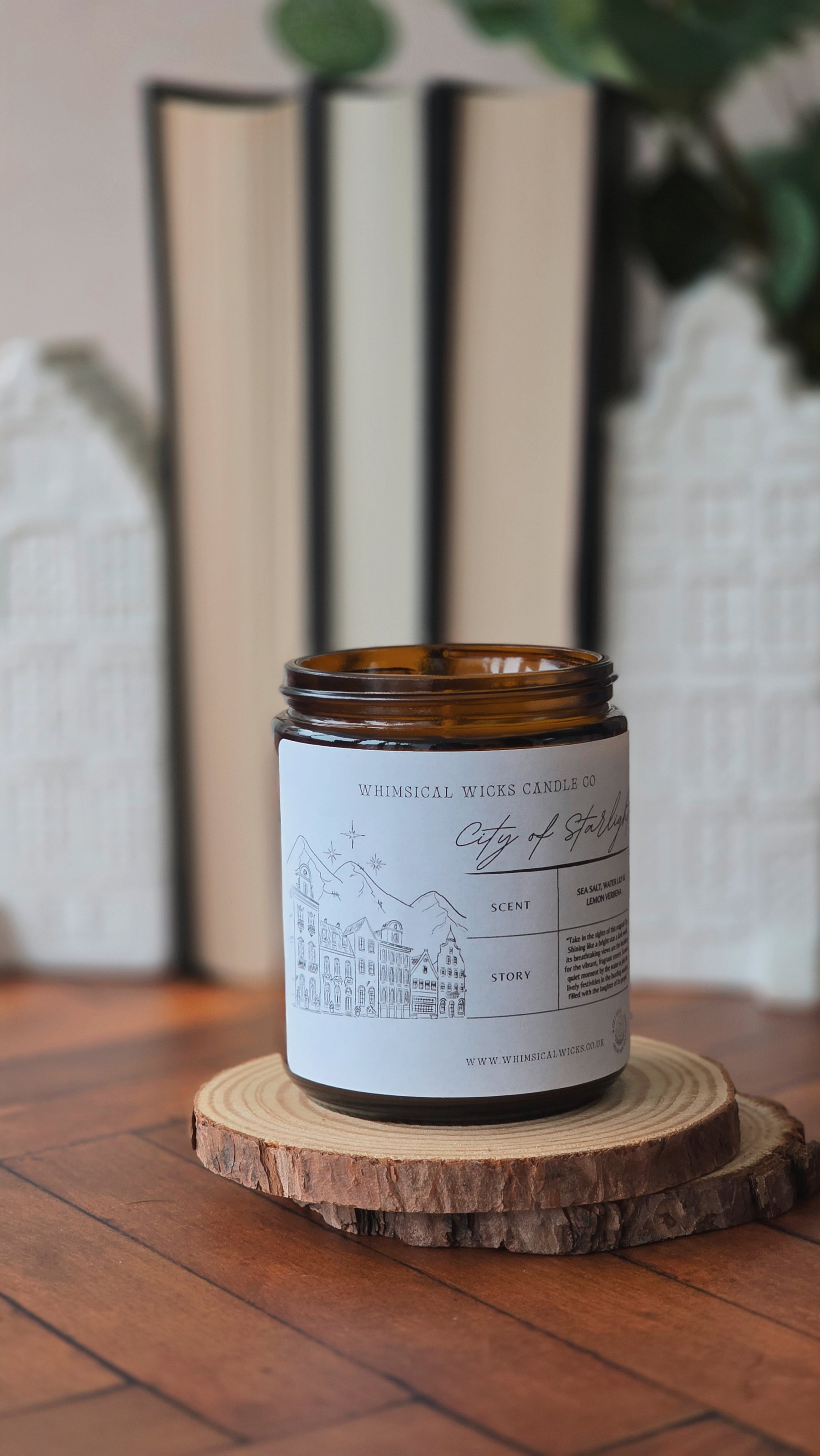 An 8 ounce vegan soy wax candle featuring a bright blend of sea salt, water lily, & lemon verbena.
