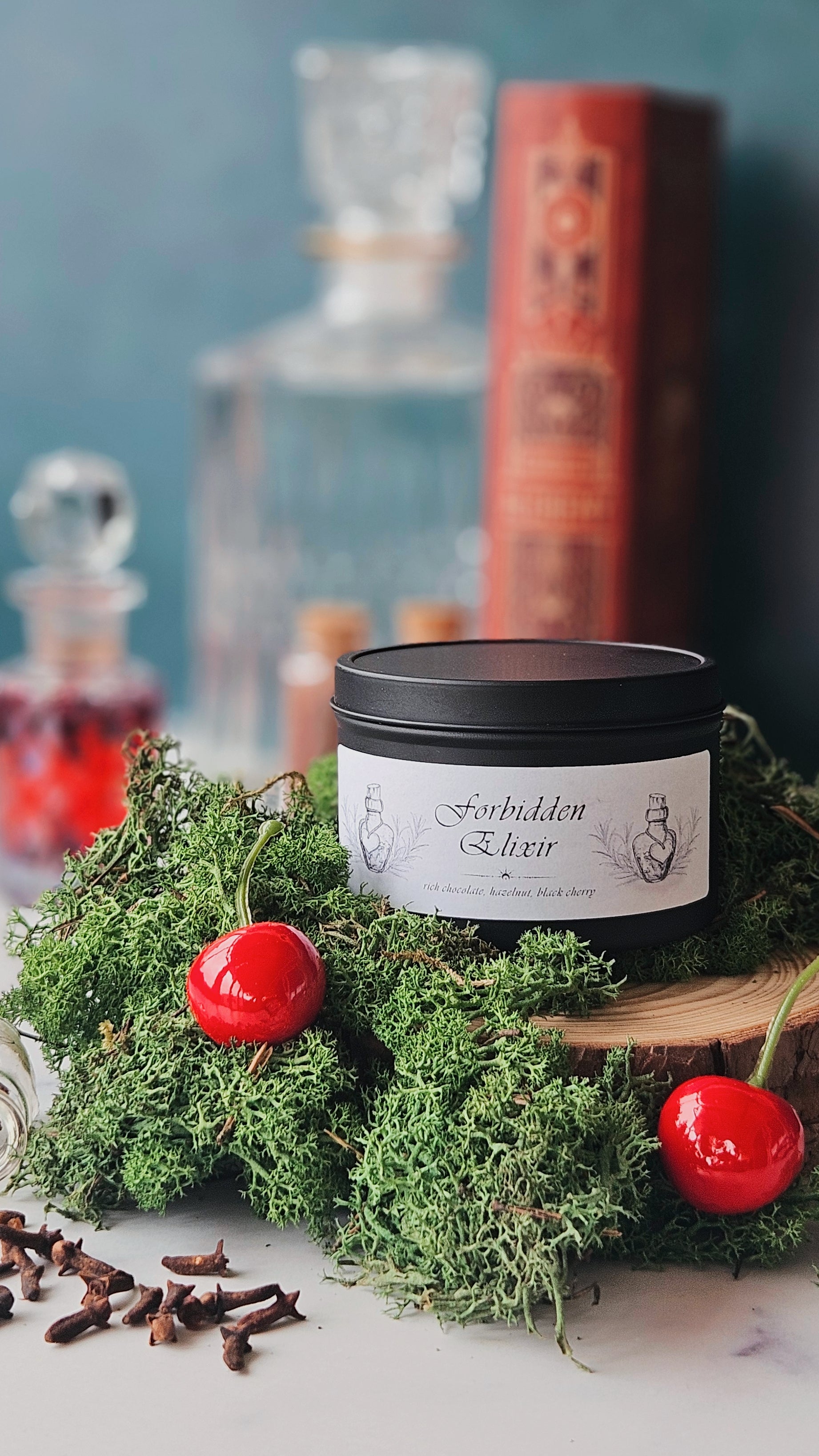 An 8 ounce vegan soy wax candle featuring a rich blend of chocolate, hazelnut, and black cherry.