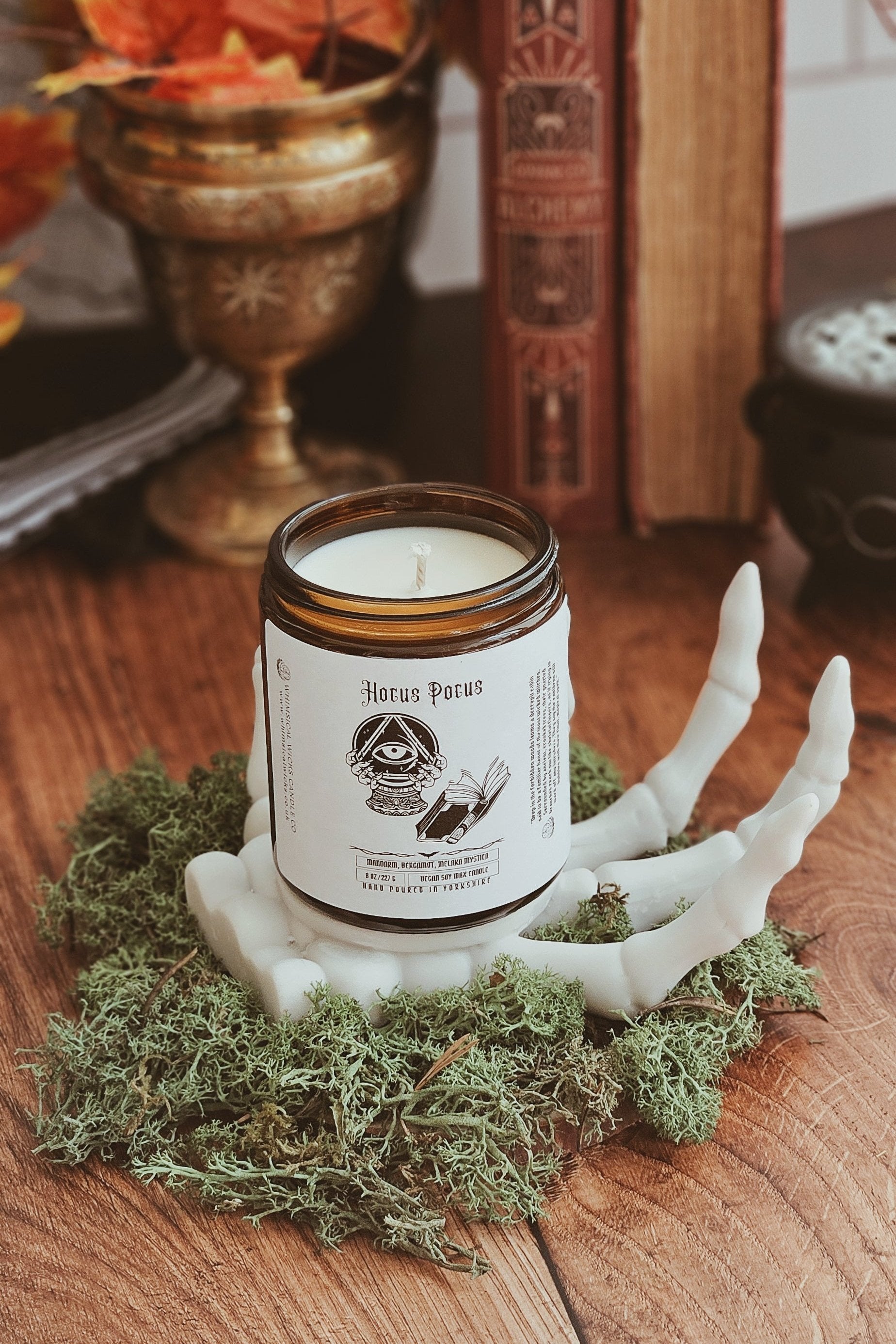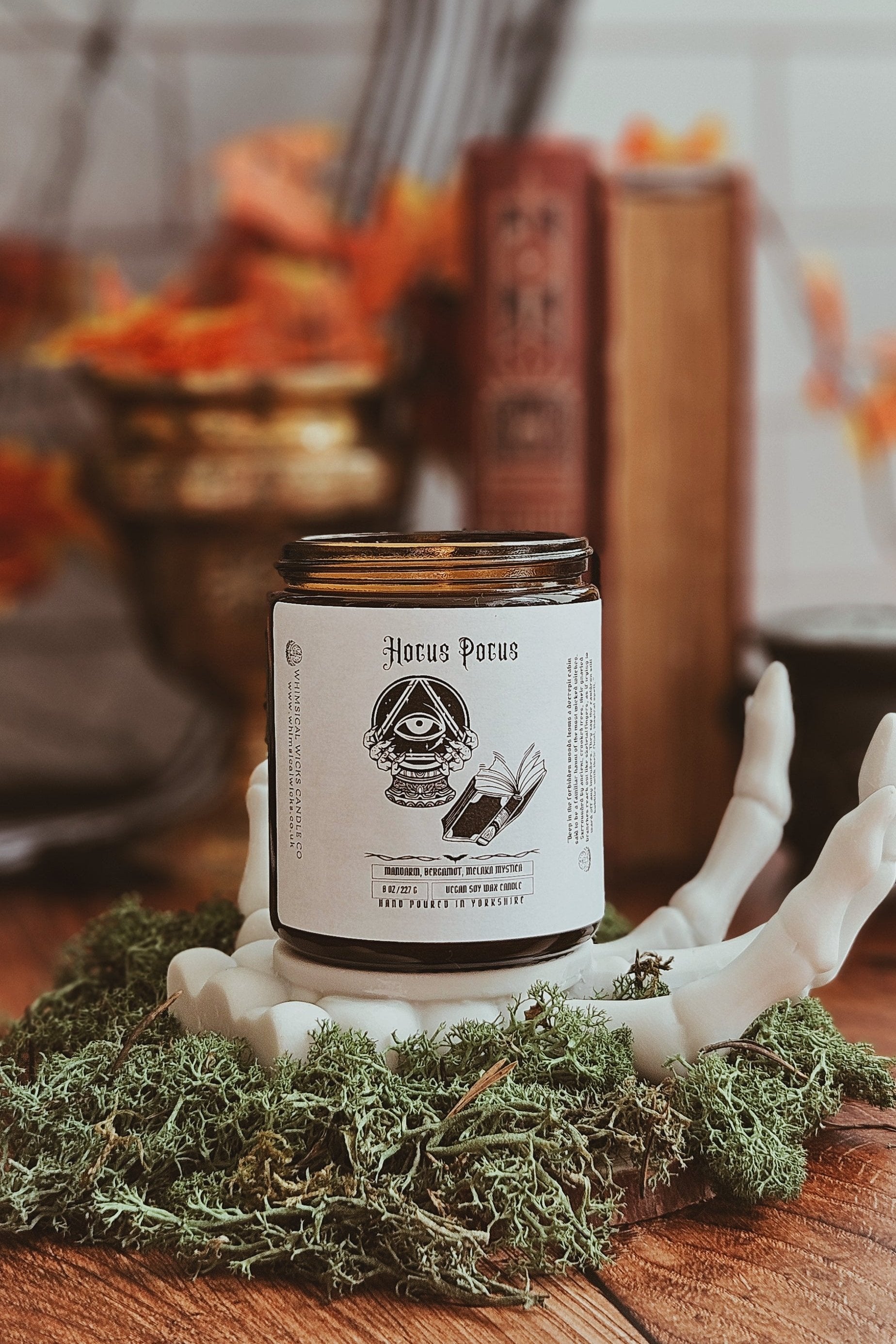 An 8 ounce vegan soy wax candle featuring a bubbling blend of mandarin, bergamot, and a dash of melaka mystica.