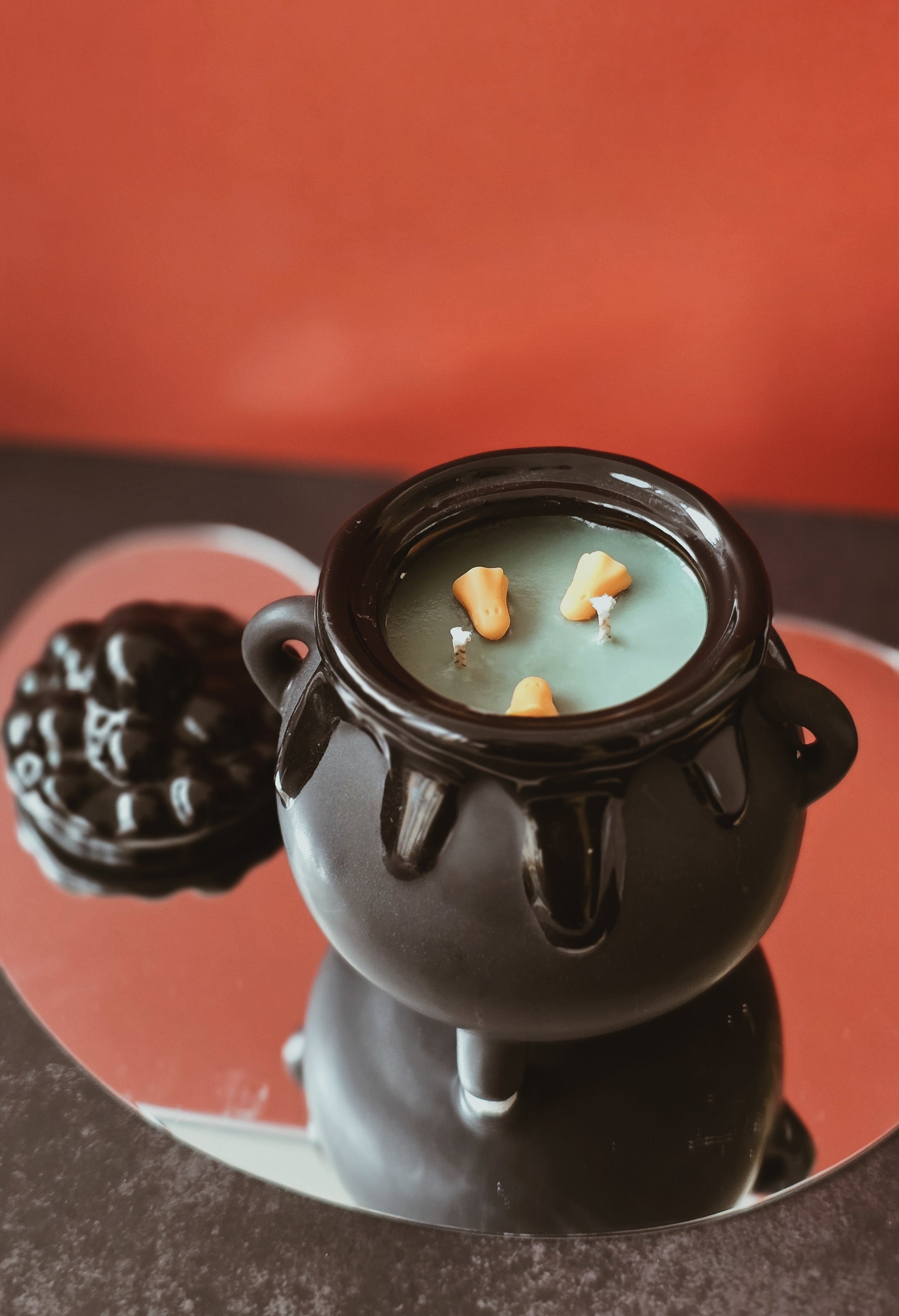 Take home this impressive 18oz soy wax candle in a earthenware cauldron complete with "bubbling" lid! Featuring one of our best selling Halloween scents - Hocus Pocus - fill your home with the delicious scent of mandarin and bergamot. Choose between orange, purple, and green coloured wax, and watch the mini ghost wax melts dissolve into the candle as it burns.