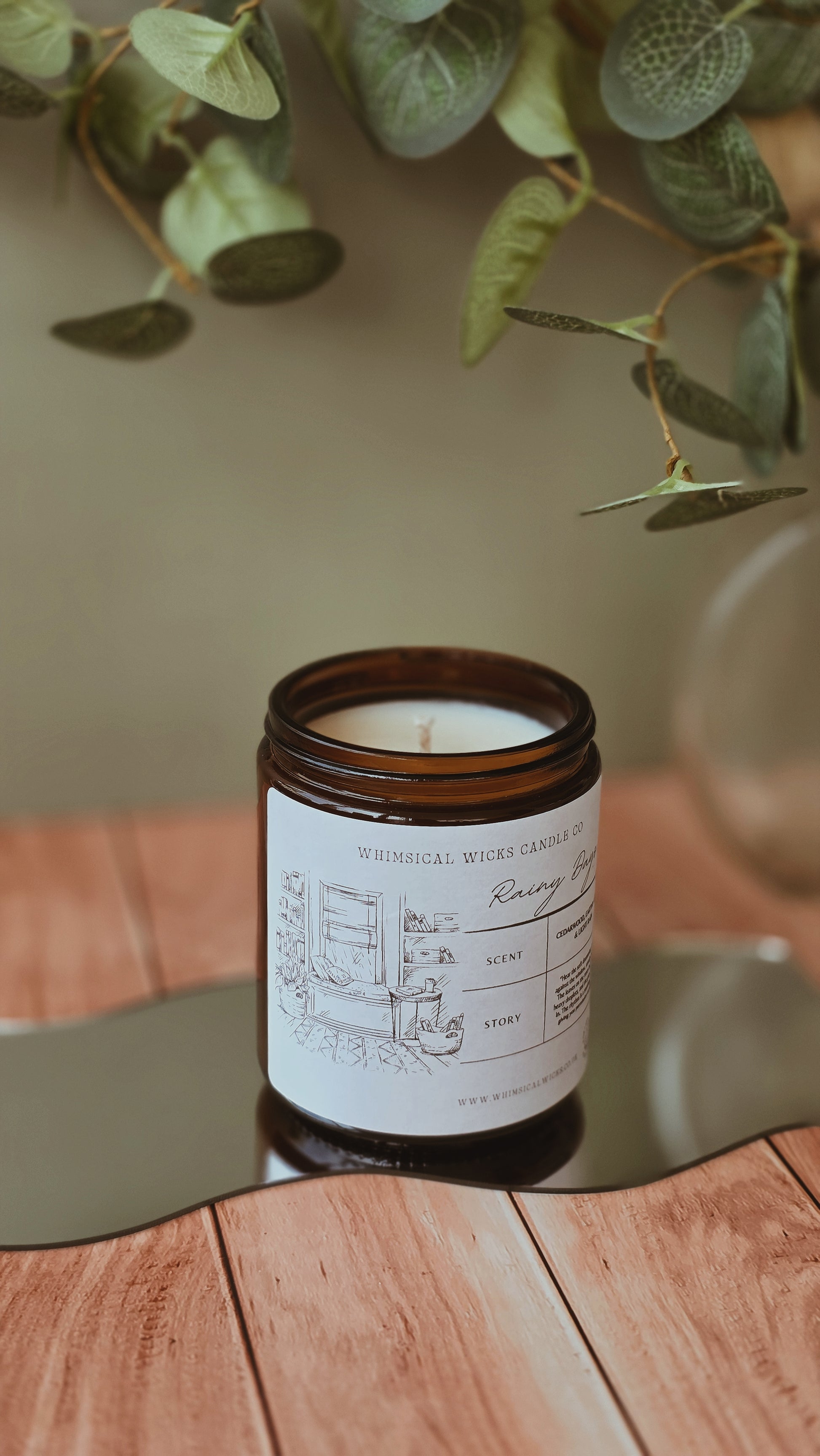 An 8 ounce vegan soy wax candle featuring a cozy blend of cedarwood, earthy moss, & light rain.